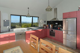 A feeling of space from the moment you walk in. The large open plan living areas with high steepled ceilings, create a sense of space and opulence. The well-appointed kitchen with its stunning vista's of misty valleys and distant ocean is a chefs delight. An entertainer's delight, with both areas opening to a large sunny elevated deck on the north side of the home. The perfect place to relax and unwind in total peace after a hard day's work .