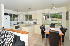 This elevated home enjoys a sense of space and openness as it soaks up all day sun. A light, airy home that is a lovely example of its 1970's era. Big open plan living area opens onto the huge entertainment deck. A place to relax and enjoy the later summer evenings.