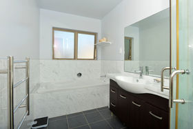 The open plan dining and lounge areas open easily out to the outdoor areas. The master bedroom has a walk-in wardrobe, en-suite and ranch slider access to an enclosed patio area. Both bathrooms feature tiling.