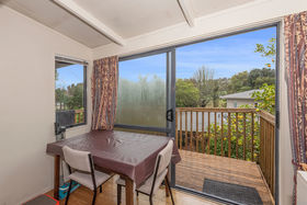 As you enter through the front door, the kitchen awaits, which is a function space and has a handy servery area - a clever use of space. The open plan design means both bedrooms are off the dining and lounge area. The separate toilet, bathroom and hidden laundry are tucked away to the left of the entry. The sliding door off of the dining area leads to a deck, that wraps around to the carport area, great for sitting out and enjoying the sun and bush outlook.