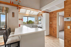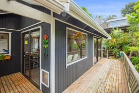 Downstairs offers a lovely open plan space for living and dining, and has two sliding doors that go off onto the large deck, which is a great covered space. The renovated bathroom has a new shower, toilet and vanity and the laundry is a separate space at the entrance. One of the three bedrooms is on this level, with great cupboard space.