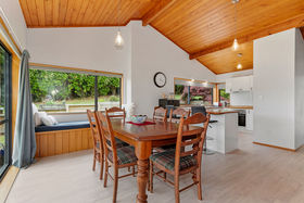 * Spacious lounge with high timber ceilings and large windows fills the space with natural light and warmth, offering beautiful rural views.